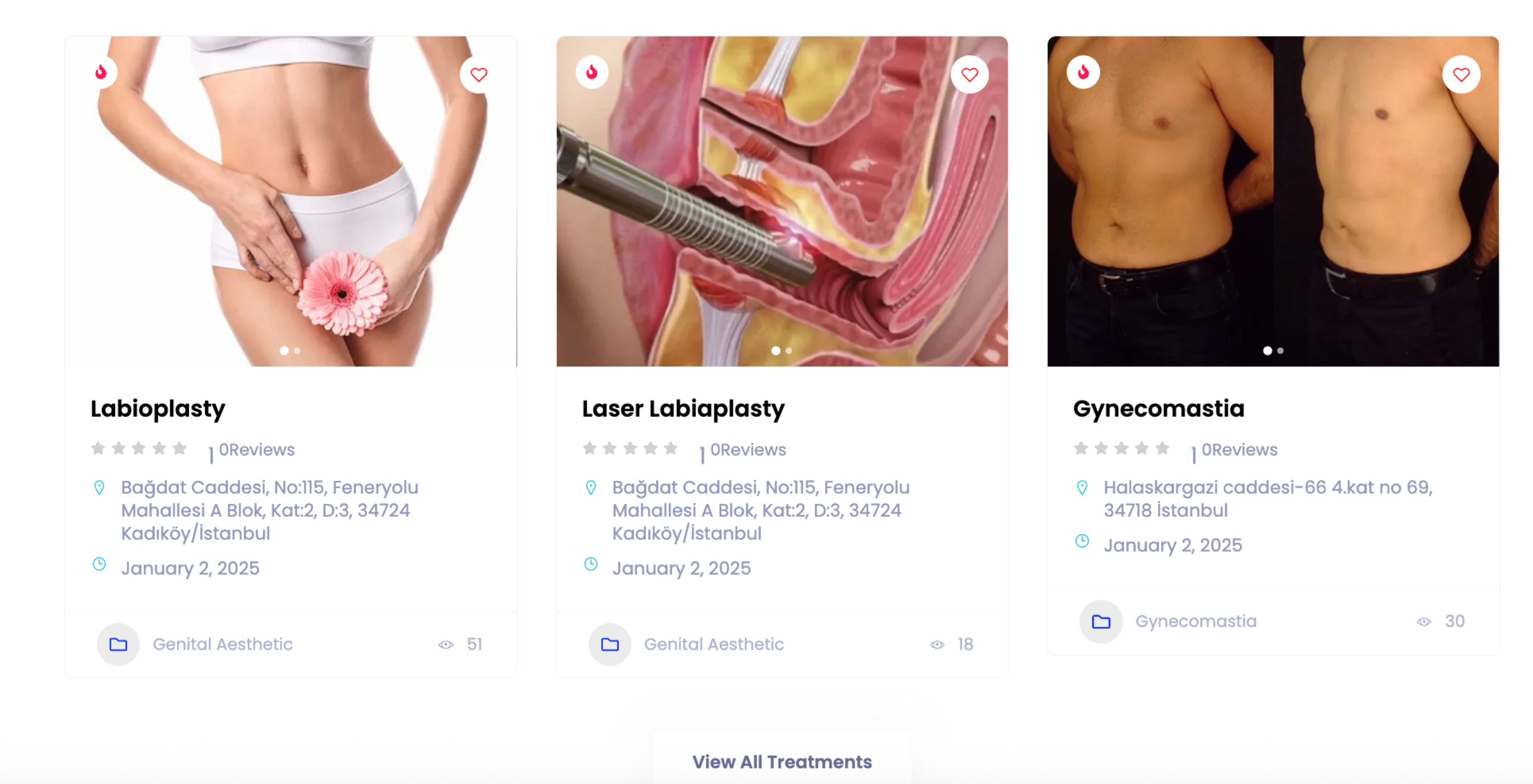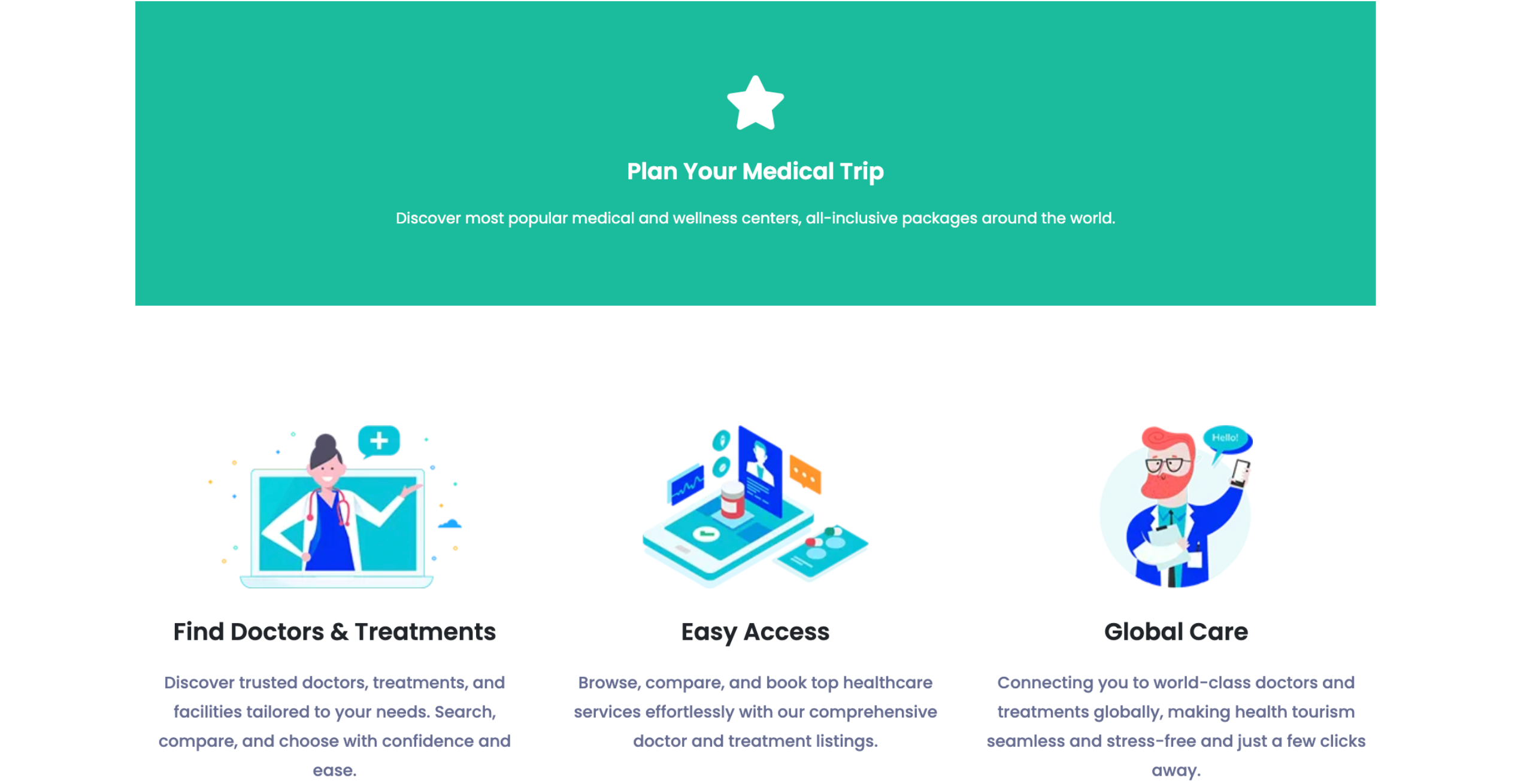 A glimpse into the HicareGo platform — from treatment listings to AI-powered patient intake.